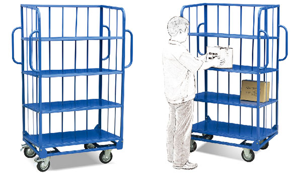 ● 散件发货,需自行组装 ● 2个定向轮,2个万向轮,带刹车 ● 两侧带推行手把 ● 层板间隔350mm ● 层板倾斜,防止货物滑落