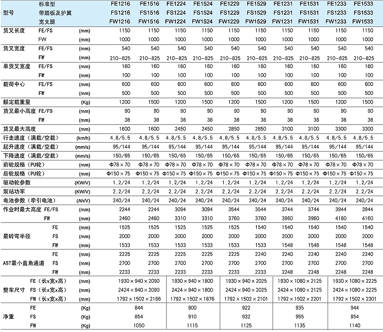 ◆ 充电器参数:输入220V/50Hz,输出30A/24V ◆ FE、FS型可调货叉可定制,可调范围340-720mm ◆ Fn系列支腿外宽为1197-1502可调 ◆ 最小直角通道AST是按照托盘尺寸(长×宽)1200mm×l000mm计算出来的 ◆ 对于货叉可调型,货叉必须对称调节,防止偏载失衡