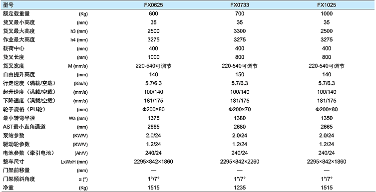 ◆ 充电器参数:输入220V/50Hz,输出30A/24V ◆ FE、FS型可调货叉可定制,可调范围340-720mm ◆ Fn系列支腿外宽为1197-1502可调 ◆ 最小直角通道AST是按照托盘尺寸(长×宽)1200mm×l000mm计算出来的 ◆ 对于货叉可调型,货叉必须对称调节,防止偏载失衡