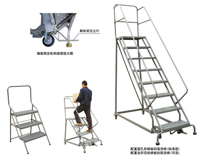 ● 配置踏板锁定机构.踩压底部踏板可自动固定梯子;踩压底部踏板下方的解除锁定压杆,便可轻松移动取货梯