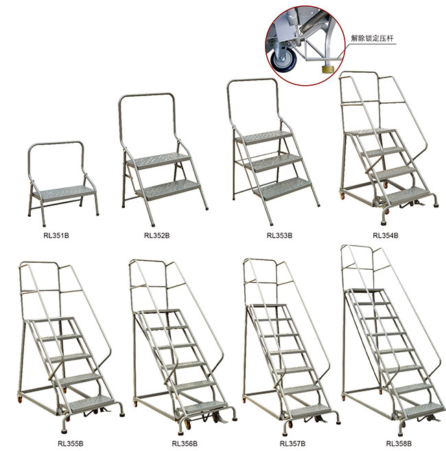 ● 配置踏板锁定机构.踩压底部踏板可自动固定梯子;踩压底部踏板下方的解除锁定压杆,便可轻松移动取货梯