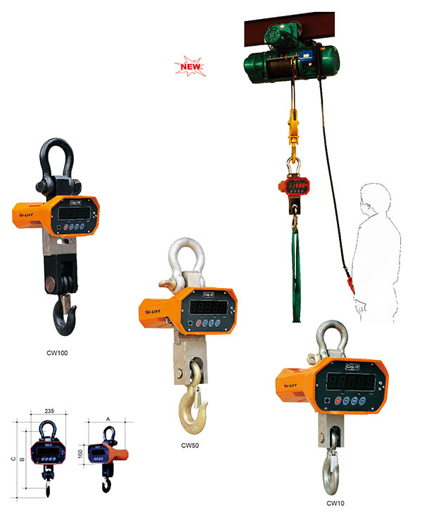 ● 300mm LED字幕显示 ● 多种称量单位转换 ● 最佳显示效果设定 ● 休眠、关机节电设计 ● 显示分度值 选择 ● 累计、查询、保持、计数 ● 自动电量指示 ● 预置皮重量 ● 符合CE安全标准 型号 CW05 CW10 CW20 CW30 CW50 CW100 CW150 额定称重量 (T) 0-0.5 0-1 0-2 0-3 0-5 0-10 0-15 分度值 (kg) 0.2 0.5 1 1 2 5 5 最小称量 (kg) 4 10 20 20 40 100 100 尺寸A (mm) 315 315 315 315 315 355 355 尺寸B (mm) 430 430 430 430 570 650 740 尺寸C (mm) 540 540 540 540 710 820 930 电池参数 (Ah/V) 10/6 10/6 10/6 10/6 10/6 10/6 10/6 净重 (kg) 10 25 25 25 30 60 60