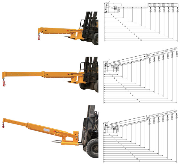 ● 吊臂有三千角度可调,适合不同工作环境要求 ● 带有二个锁紧螺柱,以及安全链条,确保货叉吊不滑落 ● 可伸缩超长吊臂,适用于叉车吊运不同区域的产品 ● 使用过程中必须考虑叉车的载荷衰减曲线图